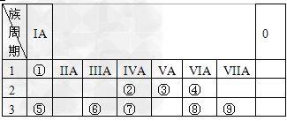 2、填空题 下表为元素周期表的一部分,请参照元素①~⑨在表中的位置,用化学用语回答下列问题