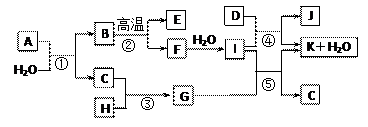 1、填空题 下图所示各物质是由1~20号元素中部分元素组成的单质或其化合物,图中部分反应条件未列出。已知C、H是无色有刺激性气味的气体,D是一种黄绿色的气体单质,物质J可用于饮水消毒。反应②和④是化工生产中的重要反应,反应⑤是实验室制备气体C的重要方法。