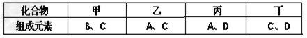 2、推断题  A、B、C、D是四种短周期元素,它们的原子序数依次增大。其中A、D元素同主族,B、C元素同周期;由A、B、C、D中的两种元素可形成原子个数比为1:1的多种化合物,甲、乙、丙、丁为其中的四种,它们的元素组成如下表所示