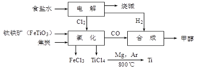 H2↑ + Cl2↑ + 2OH-;再根据图示可知氯化时的反应物为FeTiO3、C、Cl2,生成物为FeCl3、TiCl4、CO,再根据得失电子和原子守恒即可得出该反应的方程式为2FeTiO3+6C+