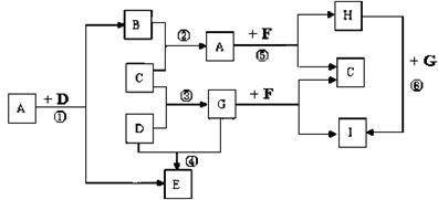 3、填空题 有A、B、C、D、E、F、G、H、I九种常见物质,它们的转化关系(反应条件未注明)如图所示。常温下A为液态,D为固态,B、C、E、G为气态(C可以使带火星木条复燃),其中B、C、D为单质,F为淡黄色粉末状化合物,I的焰色反应为黄色。