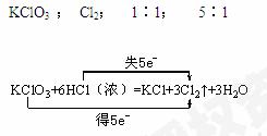3、填空题 (6分)在KClO3 + 6HCl(浓) =" KCl" + 3Cl2↑ + 3H2O的反应中,氧化剂是___________,还原产物是_________,得电子与失电子个数比是____________,氧化产物与还原产物的质量比是______,试用双线桥标出反应电子转移的方向和数目_________________________