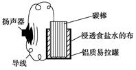 D.电子方向为:铝质易拉罐→导线→扬声器→导线→碳棒→浸透食盐水的布