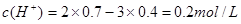 4、选择题 在H2SO4和Al2 (SO4)3的混合溶液中,铝离子浓度是0.4 mol / L,硫酸根离子浓度是0.7 mol / L,则氢离子浓度约是?(?)