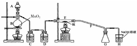 参考答案:(1)A、B分别是分液漏斗和蒸馏烧瓶;B中发生反应的离子方程式是浓盐酸与二氧化锰制取氯气的离子方程式:MnO2+4H++2Cl-△.Mn2++Cl2↑+2H2O;氯气制取过程中的产生杂质HCl、H2O,因此先用饱和食盐水除去氯气中的HCl,再用浓硫酸进行干燥即可得纯净干燥的氯气;