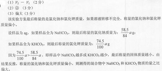 在转移溶液时,如果溶液转移不完全,则测得的混合物中NaHC03和KHC03物质的量之比?(选填“偏人”、“偏小”或“不变”)。