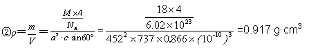 (6)常压下,水冷却至0 ℃以下,即可结晶成六方晶系的冰。日常生活中见到的冰、霜和雪等都是属于这种结构,其晶胞如下图所示(只显示氧原子,略去氢原子),晶胞参数侧棱c=737 pm,菱形底边a=452 pm,底面菱形的锐角是60°。