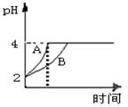 ⑵常温下,取pH=2的盐酸和醋酸溶液各100mL,向其中分别加入适量的Zn粒,反应过程中两溶液的pH变化如图所示。则图中表示醋酸溶液中pH变化曲线的是? (填“A”或“B”),设盐酸中加入的Zn质量为m1,醋酸溶液中加入的Zn质量为m2。则m1?m2(填“<”、“=”、“>”)。