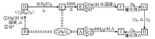 本题解析:A的碳链无支链,且1 mol A 能与4 mol Ag(NH3)2OH完全反应,说明A中含有2个醛基,所以A的结构简式为OHCCH2CH2CH2CHO,则I的结构简式为HOOCCH2CH2CH2COOH。由于B是五元环酯,所以根据B的分子式即÷可知,B的结构简式为 ,则D的结构简式为CH3CHHOCH2CH2COOH,所以C的结构简式为CH3CH=CHCH2COOH。根据已知③可知E的结构简式为BrCH2CH=CHCH2COOH,所以F、G、H的结构简式分别是
