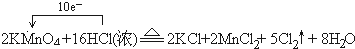 (2)反应中KMnO4→MnCl2,Mn元素化合价由+7价降低为+2价,共降低5价,HCl→Cl2↑,Cl元素化合价由-1价升高为0价,共升高2价,化合价升降最小公倍数为10,故KMnO4的系数为2,Cl2的系数为5,结合原子守恒配平后方程式为:2KMnO4+16 HCl(浓)=2KCl+2MnCl2+5Cl2↑+8H2O,反应中转移电子数目为10,标出电子转移情况为: