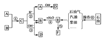 4、填空题  已知:A、B、F是家庭中常见的有机物,F常用于食品包装,E是石油化工发展水平的标志。根据下面转化关系回答问题。