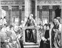 本题解析:从图片人物中的服饰可看出与教会相关,A、D所述事例均属古希腊时期;中世纪的欧洲教会实行教阶制度,等级森严,不可能出现主教与教士讨论教会事务,排除C项,中世纪大学的兴起,大学教师授课的情形,根据以上分析可知答案选B。