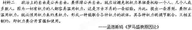 材料二 政治上的自由是公共自由,要保障公共自由,就应该避免把权力单独委托给一个人、几个人或少数人,因为一切有权力的人都容易滥用权力,这是万古不易的一条经验、为此,提出一条原则,要防止滥用权力,就必须用权力来约束权力,形成一种能联合各种权力的机制,其中各种权力既调节配合,又相互制约,即权力要分开掌握和使用。