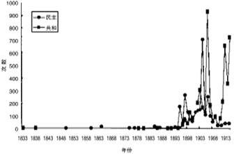 1、判断题 下图为1833—1913年“共和”、“民主”这两个关键词在部分著作和报刊中出现频率的统计图。对此图表解释正确的是