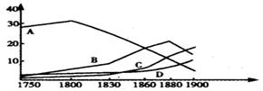 B代表英国。(1分)?英国最早开始并最先完成工业革命,生产技术、生产能力领先于世界,使其制造业占世界的比重迅速上升;第二次工业革命时期美国和德国成为技术革命的发源地和中心,导致英国生产技术与市场力下降,加之后起的美国、德国的市场竞争,因而其制造业占世界的比重明显下降。(2分)