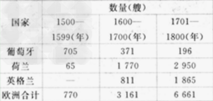 1、判断题 下表反映1500-1800年间欧洲主要国家商船抵达亚洲的数量。结合所学知识和表格信息,可以得出的推论是