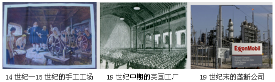 1、判断题 不同的经济时代由于生产模式的不同,导致生产组织形式也有所不同。下列三幅图片反映了14世纪以来人类社会生产组织形式的变化,对其理解不正确的是