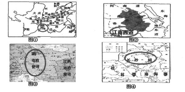 3、判断题 地区建置沿革带有鲜明的时代烙印。下面四张地图反映了湖南在不同历史时期所属行政区划的沿革状况(注:划了椭圆的标记),按时间先后顺序排列,正确的是