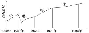 本题解析:分析此示意图,联系史实, 1933年罗斯福当选总统后实施新政,改变以往自由放任的经济政策,加强国家对经济的干预,应对经济危机,罗斯福新政后直到1945年二战结束后,西方国家包括美国在内大规模实施国家干预经济的措施,发展国家垄断资本主义,促进了经济的发展,所以从时间上排除A,从内容上排除B。世界市场早在19世纪末20世纪初就已形成,排除C,所以答案为D。