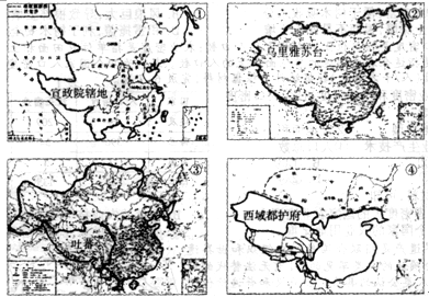 参考答案:C 本题解析:结合所学不难判断出雅典梭伦改革、秦朝实行郡县制和隋唐时期的科举制度的共同点是三者都打破了世袭特权,有效维护了社会稳定和巩固统治基础,所以答案选C,A B D三项说法错误不符合三者的共同点,即梭伦改革属于奴隶社会的改革不会加强封建中央集权,同时也未彻底解决社会矛盾。 本题难度:一般 5、判断题 图中①②③④分别是中国古代不同时期的疆域图。符合中国历史发展进程的是 参考答案:B 本题解析:该题考查中国古代对新疆、西藏地区的管辖。①西藏地区属于宣政院辖地是在元朝时期;②清朝在西北地区设乌里雅苏台;③“吐蕃”是唐朝时期对西藏的称谓;④西汉末年设置西域都护府管辖今新疆地区。故排列顺序正确的是B项。 本题难度:一般 |