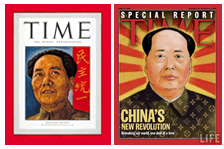 材料三 毛泽东曾12次登上美国时代杂志封面,下面两图分别是49年2月的第一次和2005年6月的第十二次,内文都作了简单描述。1949年2月报道称“毛泽东正引领着中国加入世界共产主义阵营。对西方而言,这是一场巨大的灾难。对共产主义,它是自苏联革命以来最大的胜利。对绝大多数中国百姓而言,则意味着和平。5亿困顿疲惫中国民众在上周见证了毛的辉煌--他们进入了北平。”2005年6月报道标题为“中国的新变革”:“刘丽……这个农民的女儿一直在广东一家工厂里工作,天天泡在繁密的缝纫机声响里。是的,这里谈的正是“中国制造”,全世界没有谁能逃脱的‘中国制造’,甚至连故去的毛泽东,在本期的《时代》封面里,也穿上了时髦的LV ”。