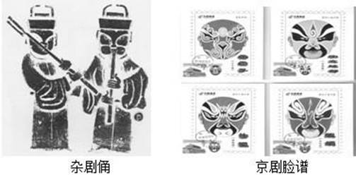 本题解析:左图体现的是代表古代戏曲艺术成熟标志的元杂剧,右边是体现京剧四大行当的脸谱,综合两者,该同学研究的应该是古代戏曲艺术。故选D。根据材料。ABC明显可以看出不正确。