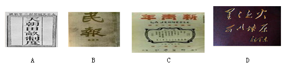 本题解析:根据题目中的内容,A是农民阶级天平天国运动中颁布的,农民阶级不是代表理事发展方向B是孙中山领导辛亥革命的机关刊物,资产阶级没有和国情相结合C是新文化运动是思想解放运动D是毛泽东的“工农武装割据”思想,既符合中国国情也代表历史发展方向。