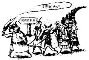 这幅漫画形象地说明了改革的局限性。在“文明”的口号下,沙皇把大批的反对者流放到西伯利亚。