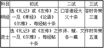 3、判断题 据陈茂同《中国历代选官制度》等记述,唐代科举考试主要科目及内容如下,以下材料说明唐代科举制