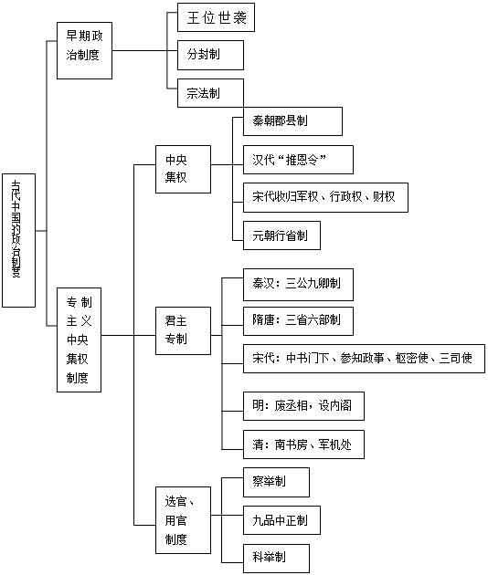 (1)皇帝制、郡县制、三省六部制、科举制、行省制、军