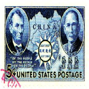 ①邮标上的人物Sun Yat-Sen和Lincoln分别是中美两国“国父”