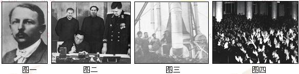 注:图一为共产国际代表马林;图二为1950年初中苏签订友好条约;图三为苏联专家指导中国工人;图四为中国留学生在莫斯科大学。?
