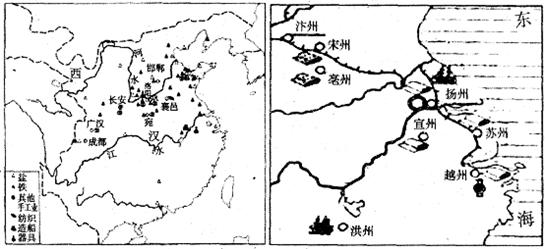 图1?西汉工商业城市分布图?图2?唐朝工商业城市分布图