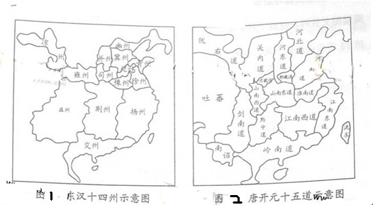 本题解析:此题是地图类的开放性比较题,解题方法是:首先要仔细观察地图,提取相关的有效信息;其次要对比所提取信息,即两幅地图的不同之处:两幅图中东汉的州的数目和唐的道的数目几乎一致,其不同之处,一是分布上,二是名称上或划分上 。最后,要结合史实进行论证:地理分布上的不同是因为东汉经济重心在北方,所以州集中分布于黄河中下游地区;而到了唐代,随着经济重心的南移,南北方“道”的分布大体平衡了。名称上或划分上的不同,可由唐代“道”的名称提取出“唐代的划分更注重山川地理形势”。