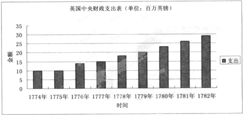 本题解析:本题主要考查学生准确解读图表信息的能力,从图表曲线中能明显看出18世纪70-80年代英国中央财政支出显著增加,结合史实可知这是由于镇压殖民地的反抗运动耗资巨大所致,答案选D,A B C三项说法错误不符合史实,A第一次工业革命时期英国政府并未投资科研;B 19世纪30年代以后英国议会才开始议会改革,C 1688年关荣革命后英国资产阶级革命的取得胜利宣告结束。