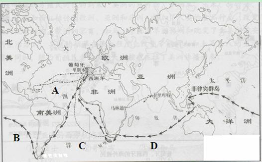 (1)15世纪欧洲人要探寻一条通往什么地方的新航路?最早到达新大陆的是A、B、C、D中哪一条航线?开辟这一航线的是谁?(3分)