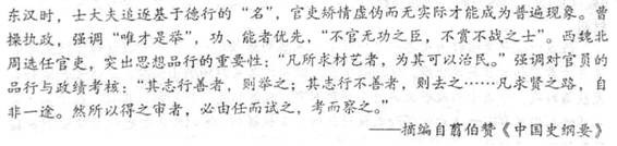 材料一 春秋战国时期,按“官有能而禄有功”的原则,废除血缘世袭的贵族制,建立起官僚行政制度。秦至汉初,秉承法家理念,功与能为官吏升迁任免的主要依据。汉武帝以后,儒生出生的官吏地位上升,官吏个人品行对于引导、教化百姓的功用日益受到重视。