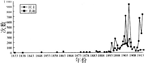 4、判断题 下图为1833——1913年“共和”“民主”两个关键词在部分著作和报刊中出现频率的统计图。对此图表解释正确的是