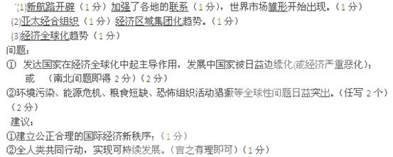 (3)结合所学知识, 材料三中的“地球村”的说法反映了当今世界经济发展的什么趋势?这一趋势(进程)还存在哪些问题?你对解决这些问题有什么建议?(7分)