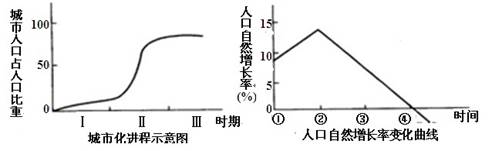 4、单选题  左图为“某国城市人口占总人口百分比示意图”,右图为“该国人口自然增长率变化曲线图”,读图回答题。