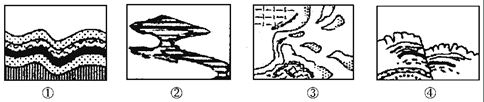 小题1:图示①表示皱褶,为内力作用;②表示风蚀蘑菇,为外力作用;③表示河口三角洲,为外力作用;④表示断层,为内力作用。故选A项。