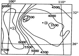 图中①处的值为6000-6500之间,②值在3000-3500之间,那么①.②两地太阳年辐射总量差值的范围在2500-3500之间,C、D答案超出这个范围,错误;最大差值就取靠近3500的B答案最合适。