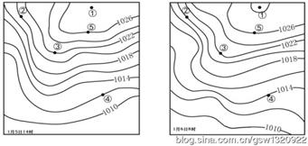 2、单选题 该图为北半球某区域2012年1月5日14时(左)和6日8时(右)海平面气压(单位:百帕)分布,读图完成问题。