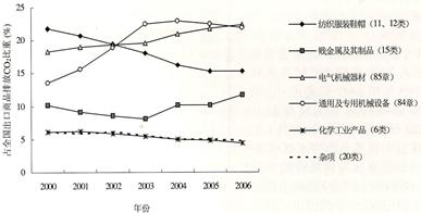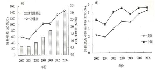 材料三:2000~2006年中美贸易顺差相关的CO2排放(a)及占本国排放的比重(b)图。