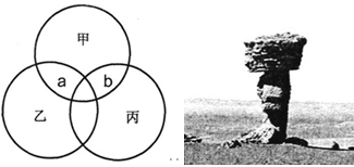 5、单选题 下左图表示大气圈、生物圈和岩石圈的某种关系。a为甲、乙问相互作用,b为甲、丙间相互作用。若a形成化石,b形成右下图中的景观,则下列判断正确的是( )