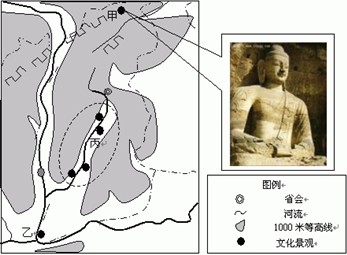 图示地区历史悠久,文化景观众多,旅游资源丰富。图中丙区域文化景区的地域形态呈条带状分布的自然条件是