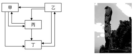 4、单选题 下图中右图表示巨蟒出山风景,它是江西三清山标志性景观,海拔1200余米,相对高度128米,是由风化和重力崩解作用而形成的巨型花岗岩石柱。左图为岩石圈物质循环示意,结合相关知识完成问题。