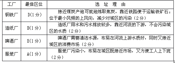 1、综合题 图4所示城镇拟在A、B、C、D、E、F六处选址建钢铁厂、造纸厂、啤酒厂和服装厂。读图并根据所学知识,进行合理的工业区位选择,填写下表。(12分)