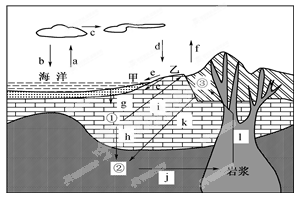 A.海岸沙滩地区主要沉积物来自于e环节 B.g、j、k环节分别形成沉积岩、岩浆岩、变质岩 C.h、i、l三环节分别属于地壳运动、变质作用、岩浆活动 D.②③两种岩石可以直接相互转化 参考答案: 本题解析: 本题难度:一般 2、单选题 海洋水体运动的主要动力是(? )