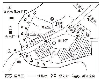 1、综合题 读“某城镇工业布局简图”回答以下问题。(11分)